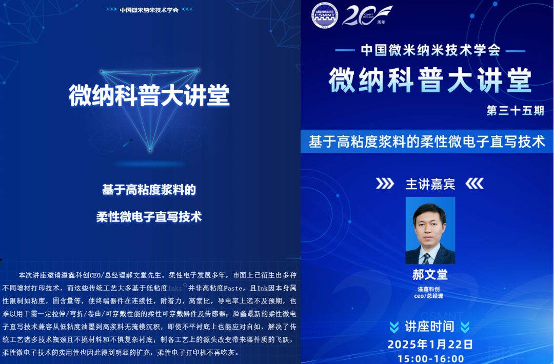 中國(guó)微米納米技術(shù)學(xué)會(huì)是國(guó)家教育部及清華大學(xué)牽頭成立的科學(xué)領(lǐng)域權(quán)威組織機(jī)構(gòu),其為普及新型柔性印刷電子技術(shù),特于2024年3月第25期和2025年1月第35期特舉辦“柔性電子”為主題的科普大講堂,兩次均特別邀請(qǐng)國(guó)內(nèi)柔性印刷電子專業(yè)供應(yīng)商---溢鑫科創(chuàng)做專題報(bào)道,內(nèi)容涉及主流柔性印刷電子技術(shù),工藝,應(yīng)用及產(chǎn)業(yè)市場(chǎng)前景等;現(xiàn)網(wǎng)上已免費(fèi)公開(kāi)講座視頻,歡迎指導(dǎo)交流,更多技術(shù)細(xì)節(jié)及應(yīng)用案例請(qǐng)聯(lián)系我司